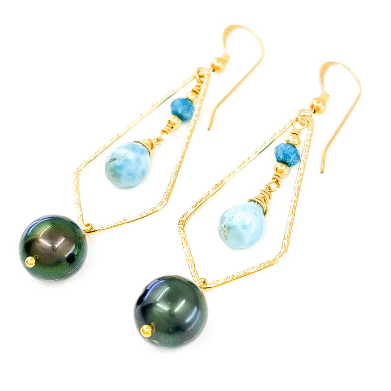 Textured Kite Shaped 14k Gold Filled Earrings with faceted Larimar and Apatite gemstone beads and 10mm Tahitian Pearls