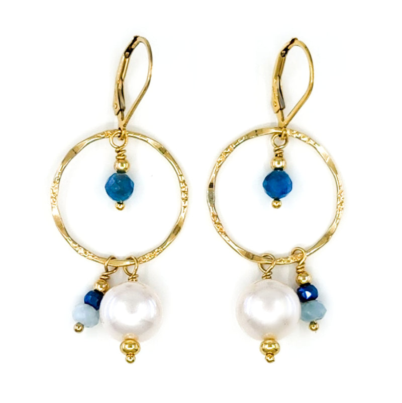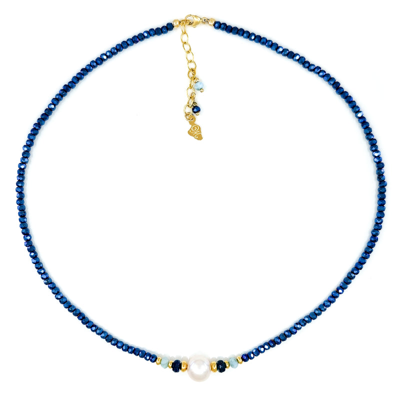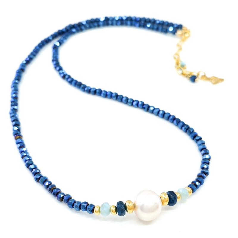Sparkly blue Hematite Beads accented with Larimar and white 9-10mm Edison Pearl in the center.
