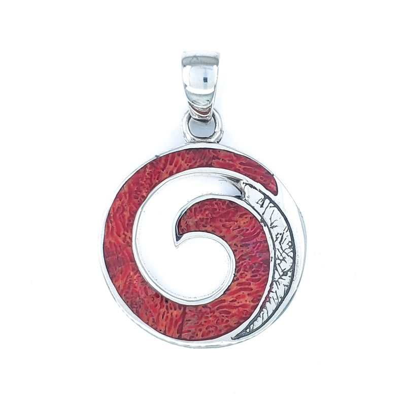 This attractive wave design represents the creative force of the famous Maui ocean waves that shape and define our island. The round sterling silver pendant is inlaid with red coral. Sustainably harvested in the Philippines, red coral displays striking red colors with beautiful natural striations.