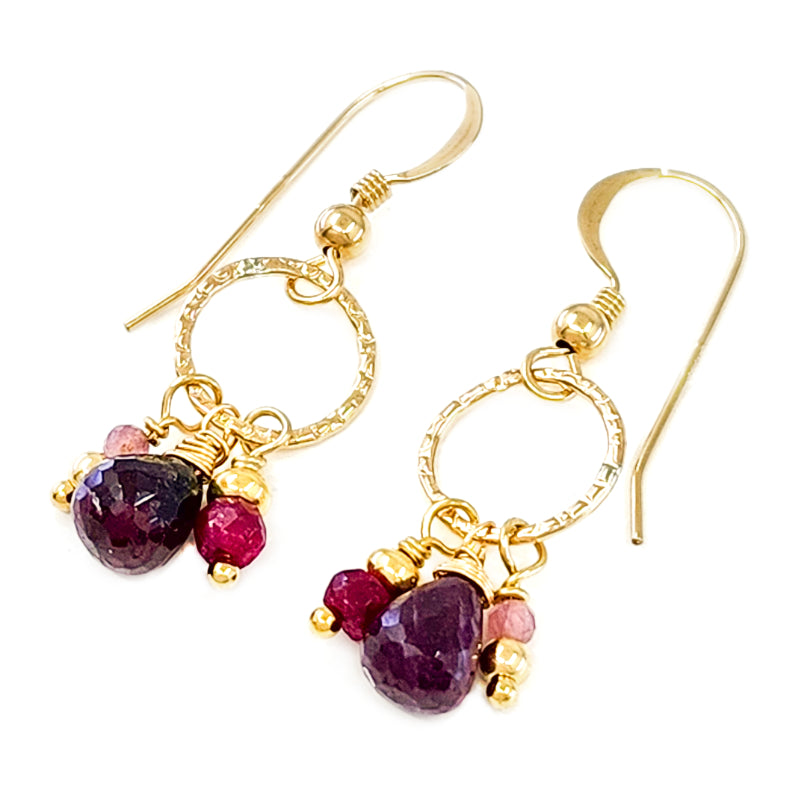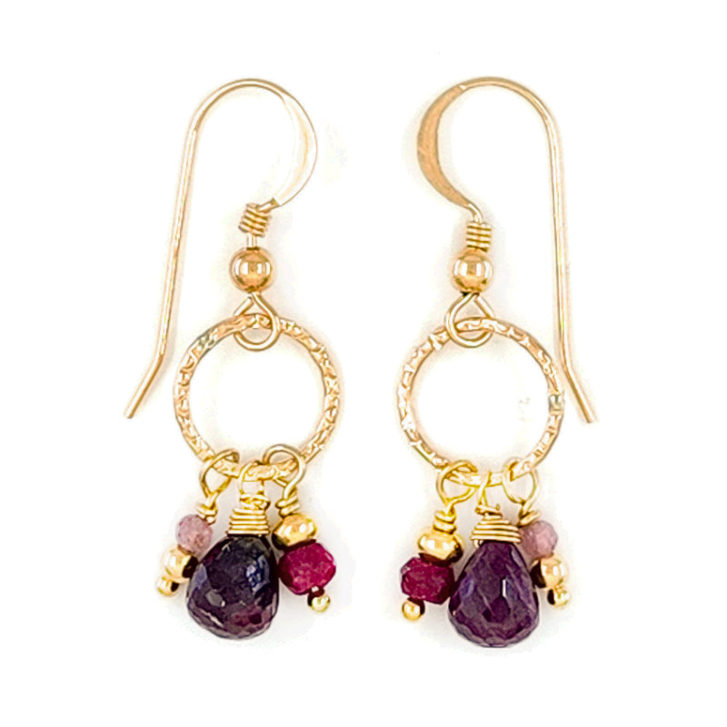 Textured round 14k Gold Filled Earrings with sparkling Ruby and Tourmaline Gemstones