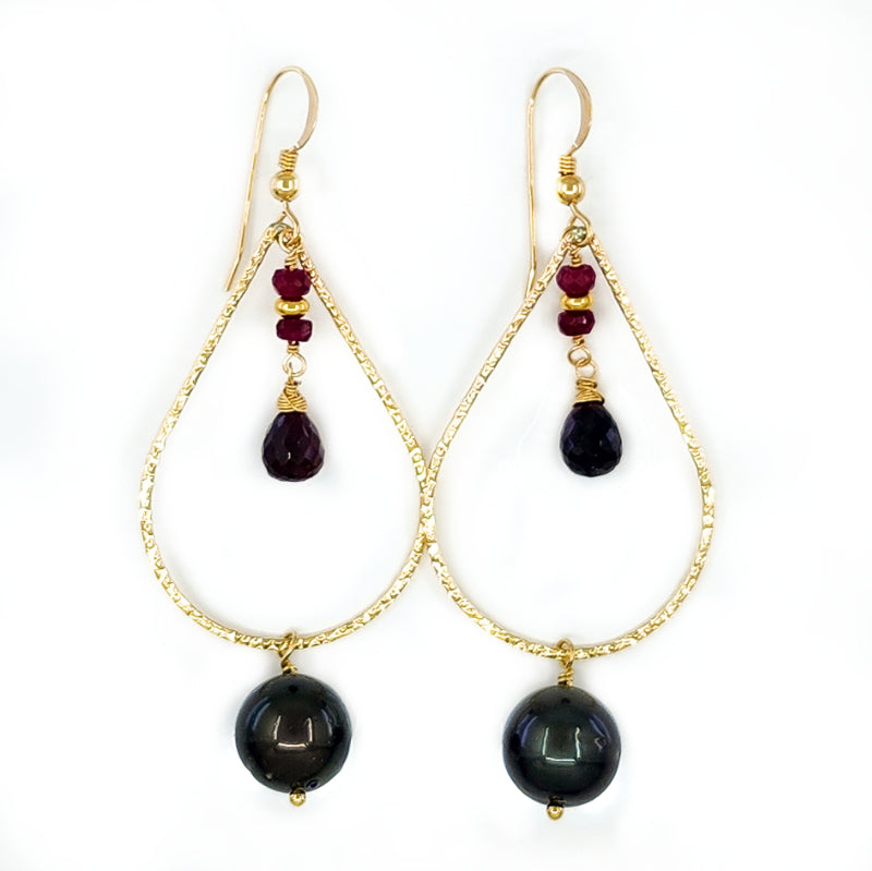 14k Gold Filled Textured Drop Shaped Earrings with Rubies, Sapphires, and Tahitian Black Pearls