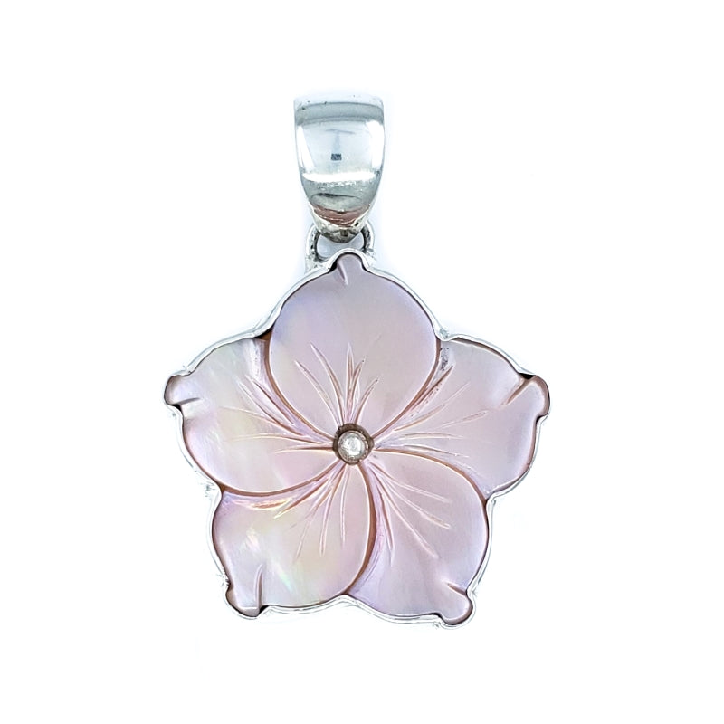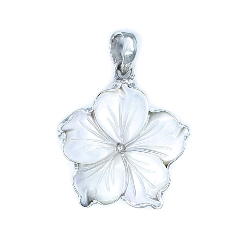 Fancy White Mother of Pearl & Sterling Silver Plumeria Flower Pendant